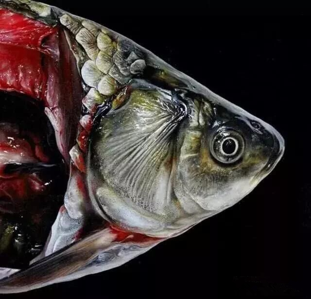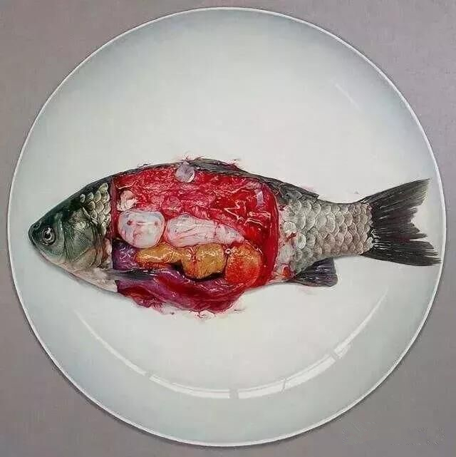 同樣是畫魚的超現(xiàn)實繪畫大師周松,他是從另一個角度對魚進行了自我的解讀。周松的油畫水平也是極高的,他是通這解剖學(xué)的油畫手法,把魚的內(nèi)臟和魚肉切開,然后用自己的繪畫功底表現(xiàn)出魚的一種血XI張力感。
