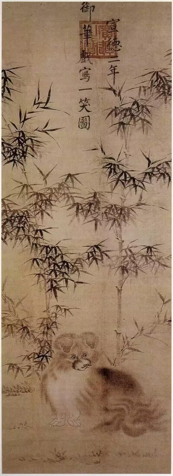 在明宣宗的存世作品中,美國納爾遜美術(shù)館所藏的《一笑圖》是最有趣的一幅。畫面十分簡單,種著竹子的庭院一角,一只小狗蹲在竹子下面,扭頭注視著畫外的某處。畫面上方有宣德皇帝的鮮紅大印“廣運之寶” ,以及親筆落款“宣德二年御筆戲?qū)懸恍D”。