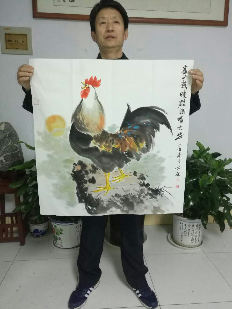 作品介紹: 盧士杰國畫花鳥畫雞系列作品《半壁見海日》,作品尺寸四尺斗方68X68CM;庚子年夏月作品。私密可訂制。