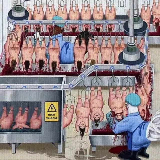 她說:"那些被倒掛在鐵鉤上砍頭流血開膛破腹的,是生命,無助的生命?!?/span>