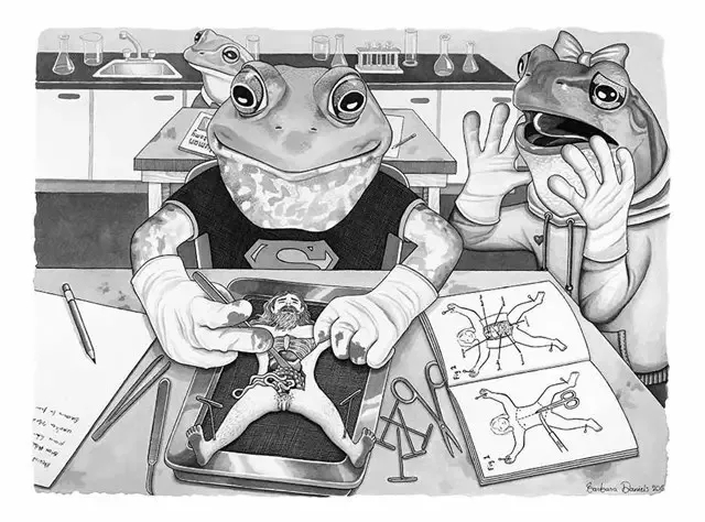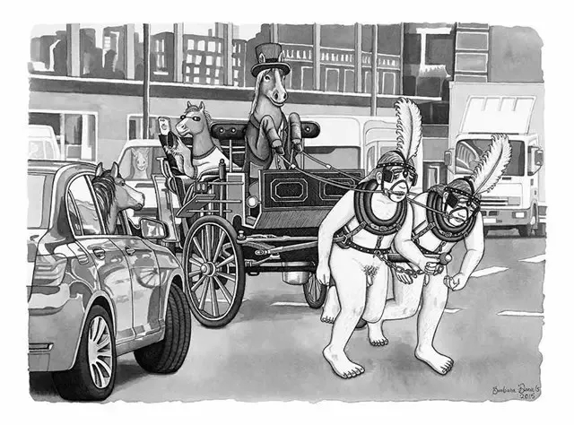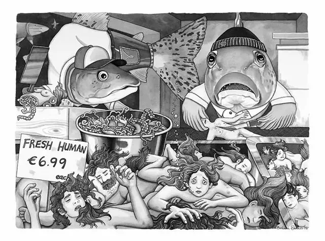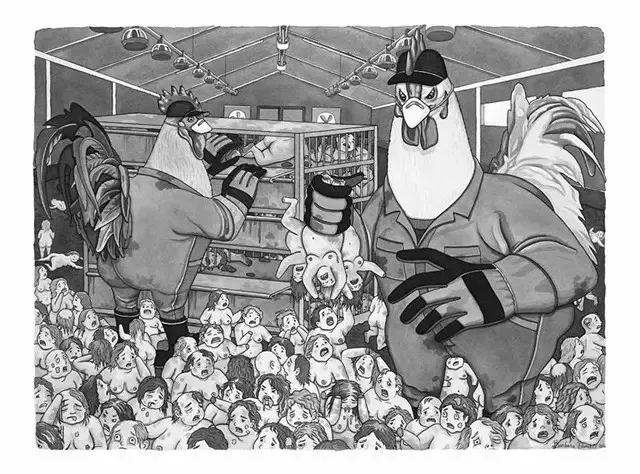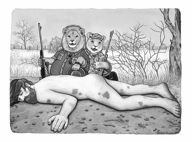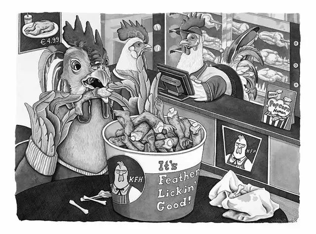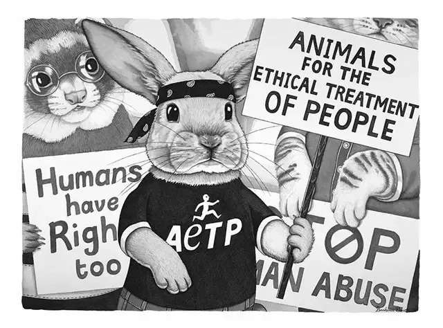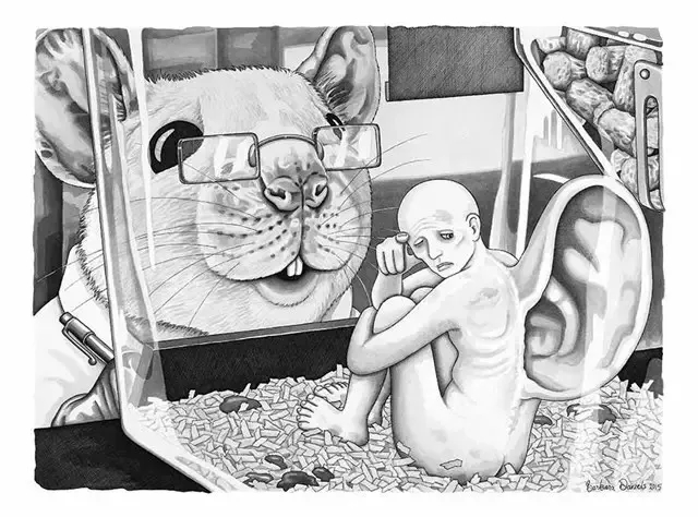 從那時候開始,Daniels便開始陸續(xù)創(chuàng)作了一系列丙烯與墨水筆畫來反思現(xiàn)代社會中,人與動物的關(guān)系。