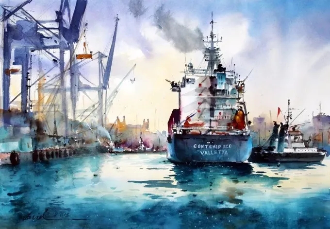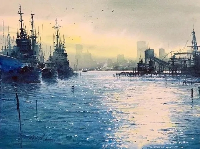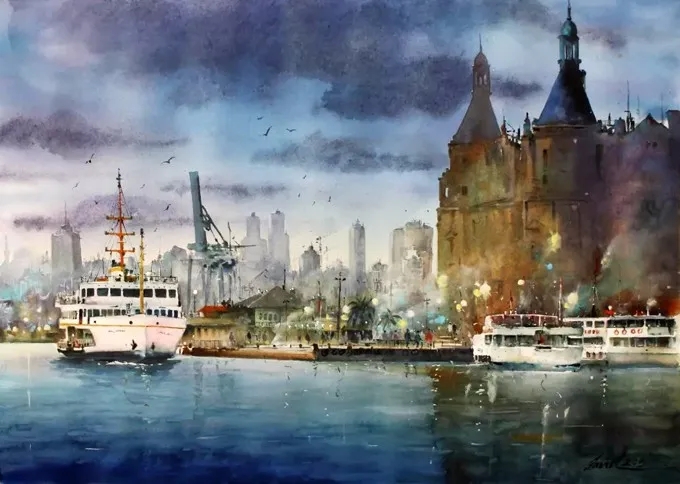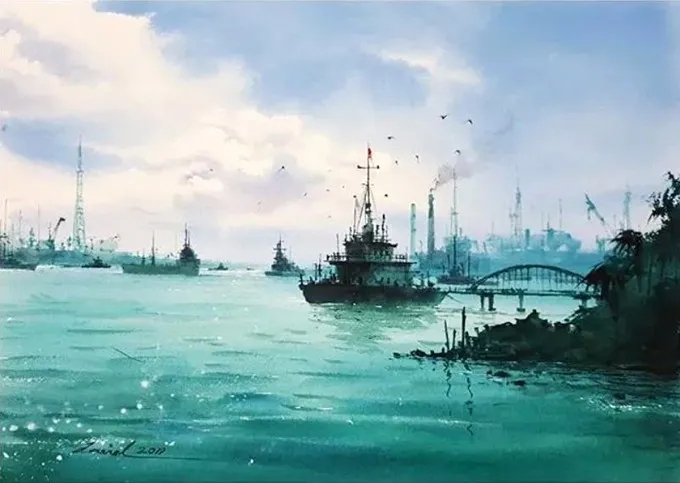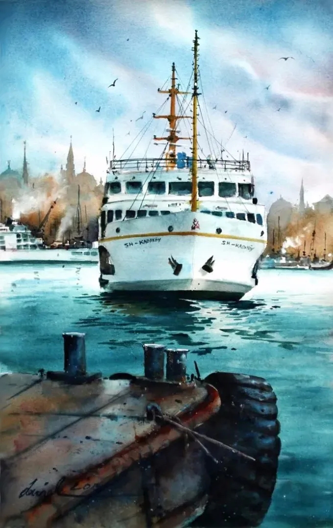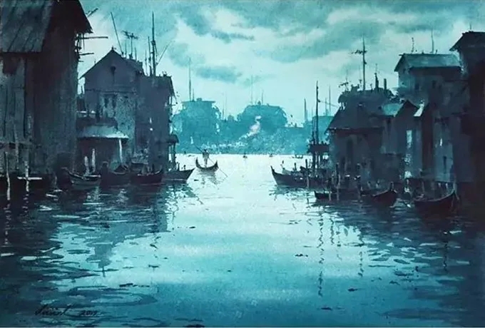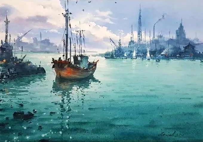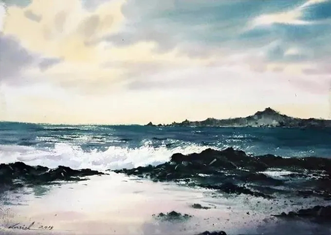 伊朗藝術(shù)家賈維德·塔巴塔比,1973年出生于伊朗德黑蘭,多次參加土耳其、法國、比利時、日本等全世界多個國家的展覽。他的作品整體呈現(xiàn)藍(lán)綠色調(diào),十分具有深意,這種用藍(lán)綠色來表現(xiàn)海天景色,水潤感、色彩感都十分充足,是獨(dú)具魅力的水彩藝術(shù)作品。?—— 前言