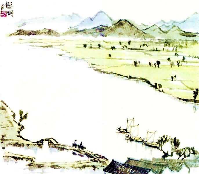 畫(huà)畫(huà)前,先醞釀情緒,再設(shè)計(jì)方法。對(duì)風(fēng)景對(duì)象將信將疑,意境還不十分鮮明的時(shí)候,坐下來(lái)慢慢細(xì)看,有時(shí)會(huì)得到啟發(fā)。我畫(huà)《鑒湖》就是如此本來(lái)興趣不很高,定下心來(lái)凝視,飽覽?看,想到古人所說(shuō):“湖光如鑒”,覺(jué)得有所啟發(fā),意境醞釀得比較成熟了,經(jīng)過(guò)組織加工,終于畫(huà)成了一幅畫(huà)。古人說(shuō):“萬(wàn)物靜觀皆自得?!背梢?jiàn)往往使人聽(tīng)而不聞,視而不見(jiàn)。