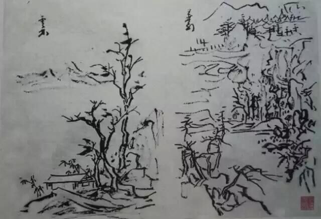 一是劍脊法,線之中間留有一條白痕,兩面光,宜畫秋樹枯木,非下苦功,不易得法。一是圓柱法,線之中間有一條黑痕,兩面光,畫巨石常用,畫樹亦可。