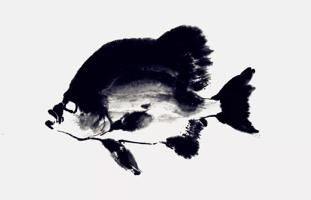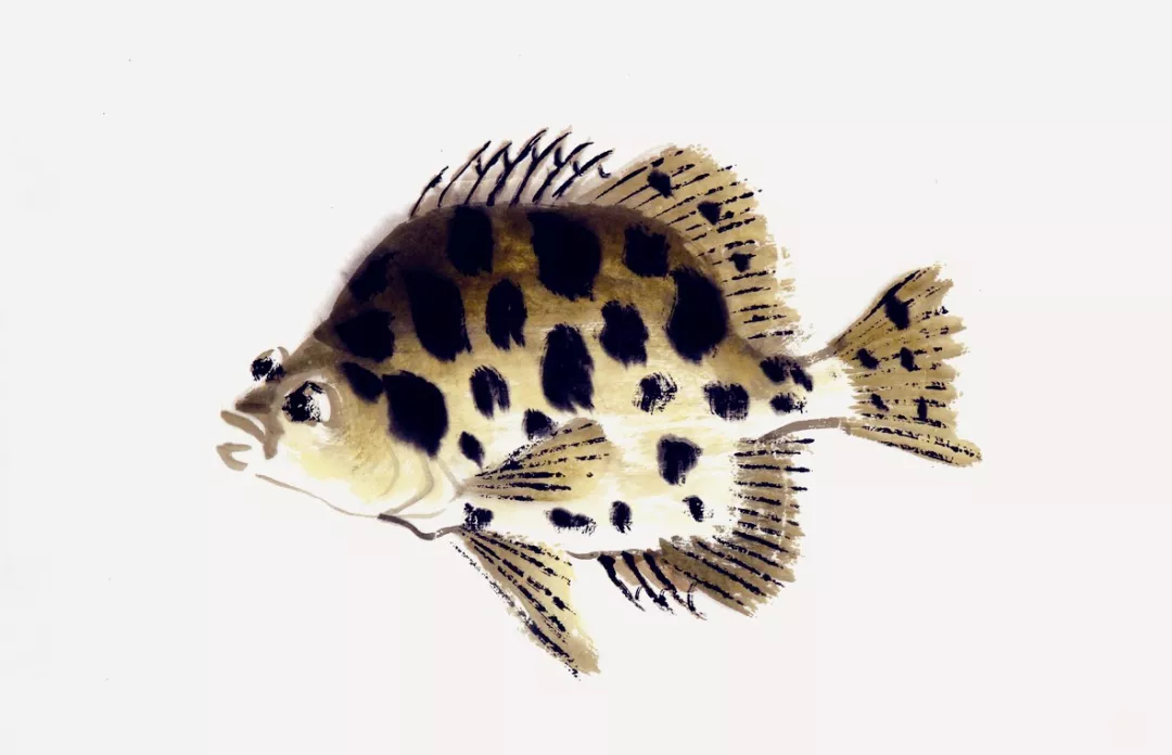 描繪金錢魚,要先以水墨畫出其大致形體,以濃墨畫出魚的頭部,再以水墨畫出各鰭并勾出魚身輪廓線。(見圖一)趁墨色未干之際,以濃墨在魚身上錯落有致地點出斑點,然后以焦墨勾出棘刺并點睛完成。(見圖二)