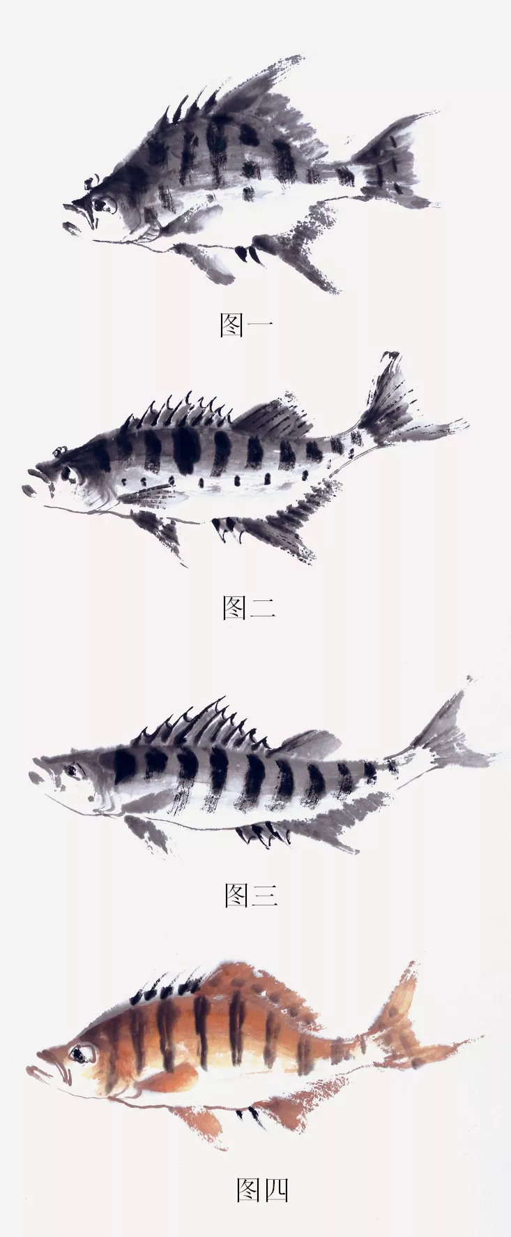 這類熱帶魚的畫法與之前所介紹的幾種熱帶魚的繪畫方法無異。無論是濃破淡法、淡破濃法還是彩墨法,皆適合用于對其描繪,而具體選用的畫法方式則要視作品的具體情況而定。(圖一至圖四為幾種不同熱帶魚的畫法示意圖)
