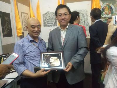 東盟-中國經(jīng)貿(mào)發(fā)展促進會常務(wù)副會長沈鈺淇與柏波及麥稈畫作品【熊貓圖“春夢”】合影紀念!