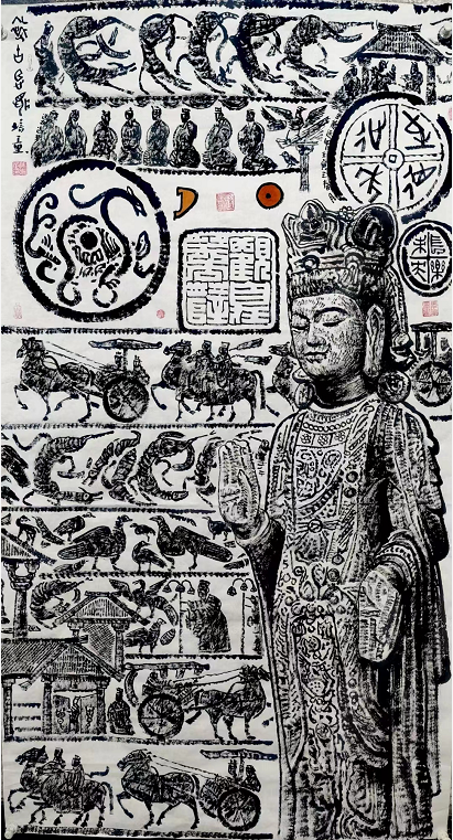 馬培童是徐州人,對徐州的畫像石十分熟悉且有感情。他不僅把畫像石的內(nèi)容化作人像、佛像的筆墨,而且整個(gè)畫面都有畫像石的感覺,但畫出來又是佛像或人像。